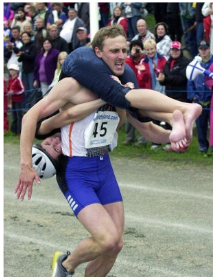 Il s'agit du porter de femme!C'est une competition vennue de la Finlande, mais elle est connue dans tous les pays du Baltique. Elle consiste en porter la femme du couple (c´est toujours un homme et une femme) jusqu'au but de la course au plus vite possible.