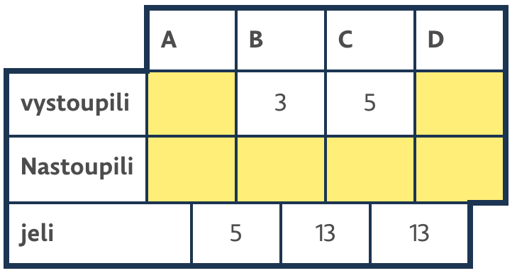 Tabulka popisuje počet cestujících, kteří nastupují a vystupují na zastávkách A, B, C a D. Zastávky A a D jsou konečné. Na zastávku A přijíždí autobus bez cestujících. Na zastávce D vystoupí všichni cestující. Dodržujeme pravidla slušnosti – na každé zastávce se nejdříve vystupuje a až potom nastupuje. Kolik cestujících nastoupilo na zastávce C?