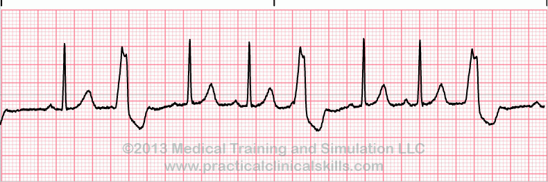 Vidíme křivku s úzkými ("hezkými") QRS komplexy s vlnou T nahoru. To je normální obraz. Mezi těmito pěti normálními QRS komplexy jsou tři , které vypadají úplně jinak ("ošklivě") a jsou ŠIROKÉ. Po nich následuje vlna T dolů ("zase ošklivé") Není možné aby se signál přenášel ze síní a normálně vedl přes komory (byl by normálně úzký) Jsou to tedy stahy komor, které se přenášejí jinudy = pomaleji.Nejde o artefakt, protože je to třikrát stejné, není to FiK, protože to má nějakou pravidelnost, a není to těsně za sebou jako při KT. Jsou to jen extraxsystoly (vmezeřené stahy) a to KOMOROVÉ !!!