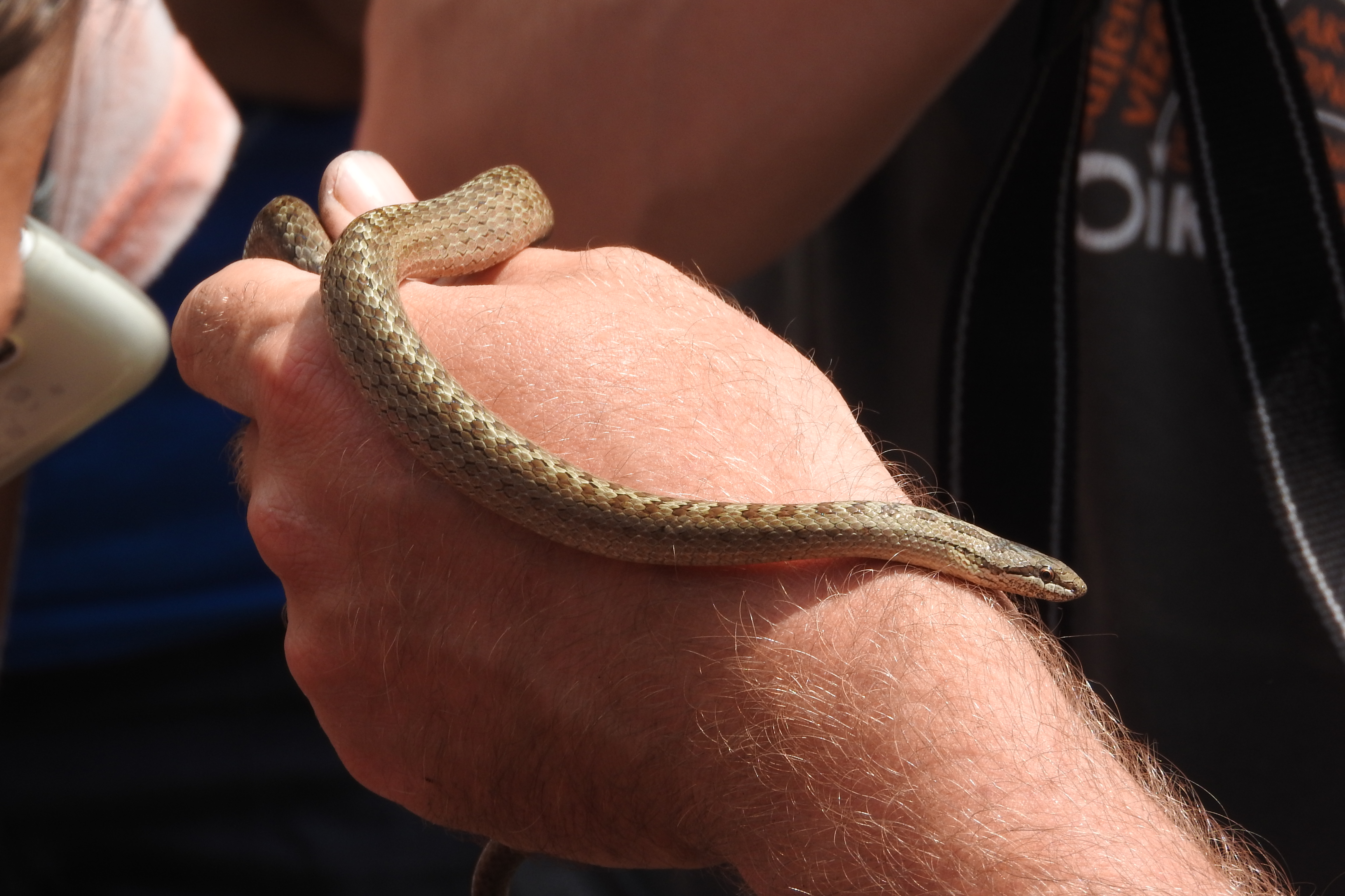 Ačkoli se občas stane, že je někdo pohroma kvůli útěku korálovky z domácího chovu, v přírodě potkáte jen užovky a zmije. Toto je užovka hladká - narozdíl od zmije ji odlišíte kulatou zornicí v očích (zmije má svislou) a tím, že bývá často větší, zatímco zmije je obvykle do 60 cm dlouhá. Na vzor a barvu však nehleďte... užovka hladká občas připomíná zmiji jak tvarem hlavy tak kresbou a barevnost zmijí i užovek může být proměnlivá (hnědá, šedá...).